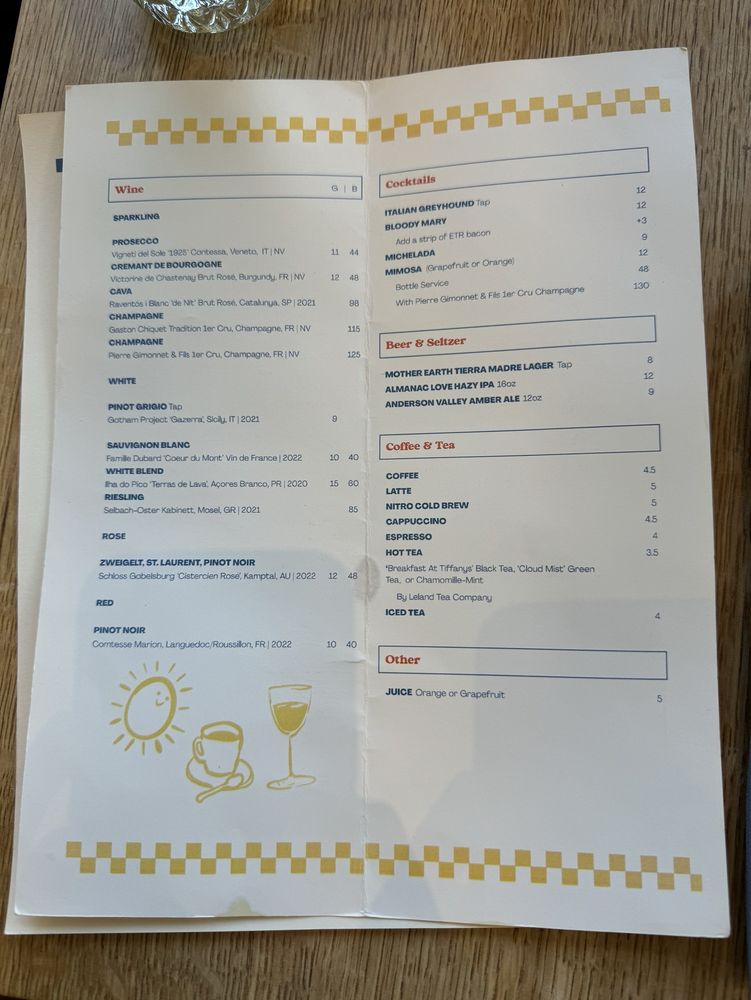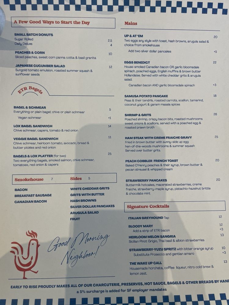 “ We went to Early to Rise on a Saturday morning without a reservation. It was still early, but the place was already filling up. The hostess was really friendly and got us seats at the counter, which was a great spot since we could watch everything being made in the kitchen. Our server was just as welcoming--he asked if it was our first time, explained the menu, and made sure we had everything we needed. We ordered a few dishes, but the surprise standout was the side of bacon. It was cooked perfectly, well-seasoned, and definitely worth ordering. Drinks: The coffee was great, and I liked that they sell bags of it to take home. I had the Italian Greyhound (on tap), which was really good. Since they don't have a full liquor license, I appreciated how they worked with low-proof and agave spirits. Instead of just throwing mimosas or wine on the menu, they actually put effort into making interesting cocktails. Food: We got the Eggs Benedict, which was spot on. Everything was cooked right, and I liked that it came with grits and greens instead of a plate full of potatoes. My husband thought he hated grits until he tried these--he said they were amazing. Atmosphere: The restaurant is well laid out. The kitchen is on the right when you walk in, with a counter for a few people and the main dining area made up of tables and banquette seating. The bathrooms have wallpaper featuring local spots, which was a nice touch. Nothing over the top, just a solid, well-run place to get breakfast or brunch. ”